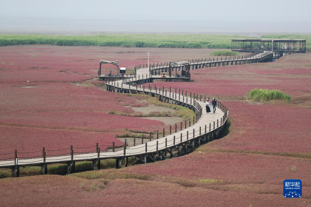 近日,遼寧盤錦紅海灘國家風景廊道內的鹼蓬草迎來最佳觀賞期,紅灘綠葦,景色優美,吸引游客前來觀賞游玩。