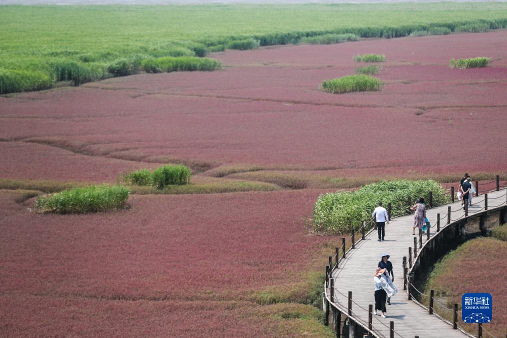 7月19日,游客在紅海灘國家風景廊道景區內游玩。