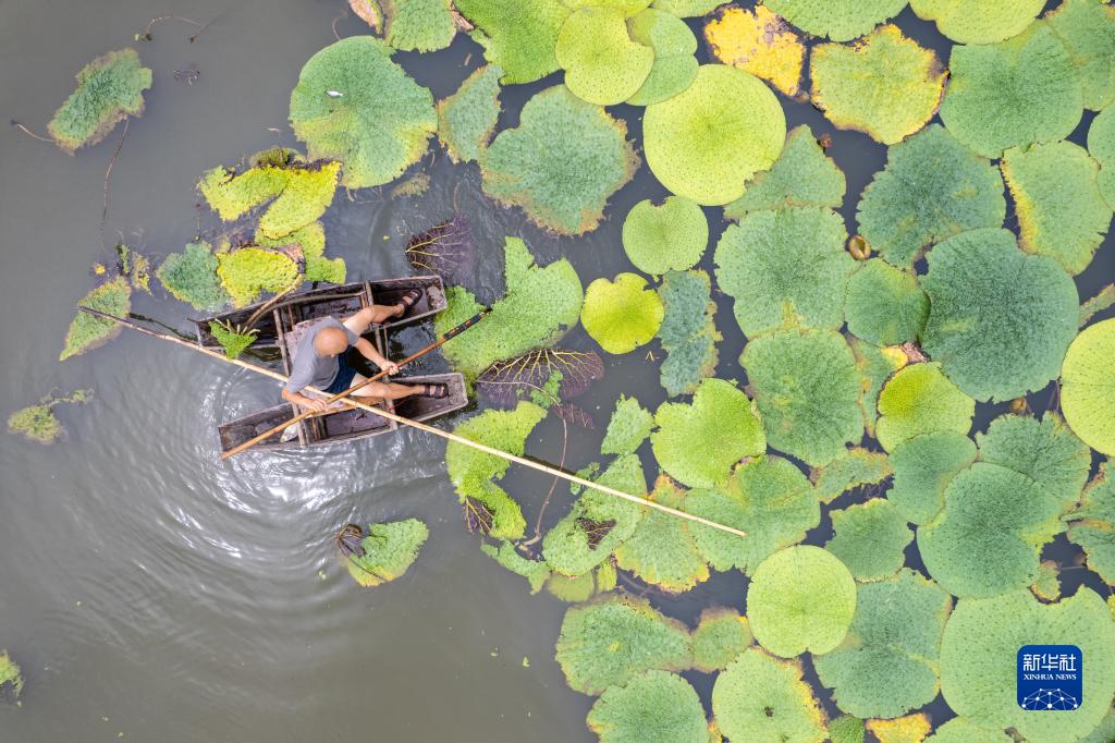 7月19日,在南縣麻河口鎮曹家鋪村,村民在采收芡實和芡實根莖(無人機照片)。