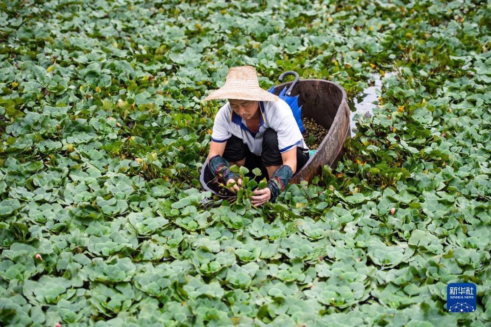 盛夏時節,位於洞庭湖腹地的湖南省益陽市南縣種植的菱角、芡實、蓮蓬、藕根等多種水上作物進入成熟期,為保證産品新鮮,當地農戶每天上午在塘內集中采收後第一時間送至市場。目前,南縣的多個鄉鎮均有菱角、芡實、蓮蓬、藕根的連片種植點,總體面積達2萬餘畝。