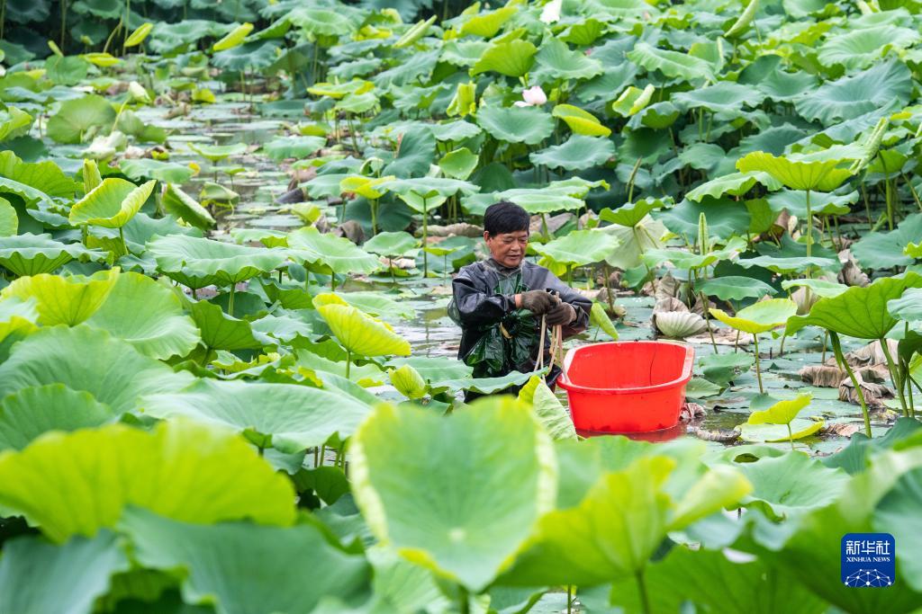 7月19日,在南縣華閣鎮光復漁村,村民在采收藕根。