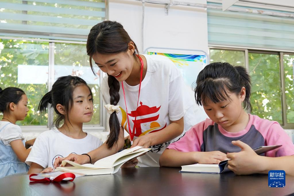 7月18日,在無棣縣棣豐街道星湖社區服務中心,返鄉大學生志願者輔導孩子閱讀。