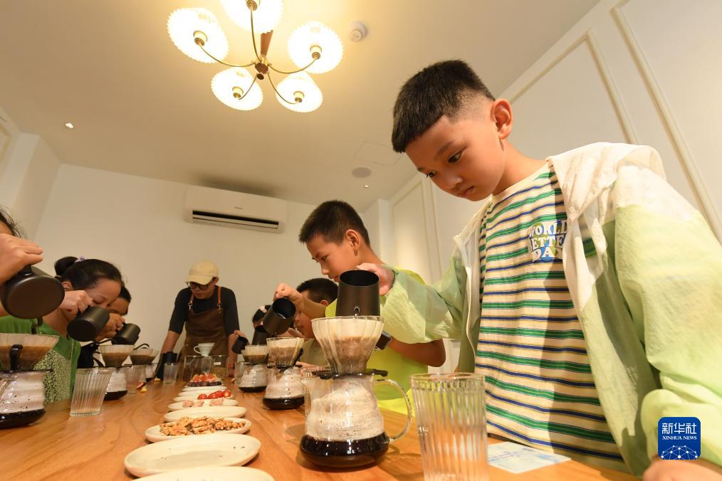 7月19日,青少年在小西街一家咖啡館體驗手衝咖啡製作。