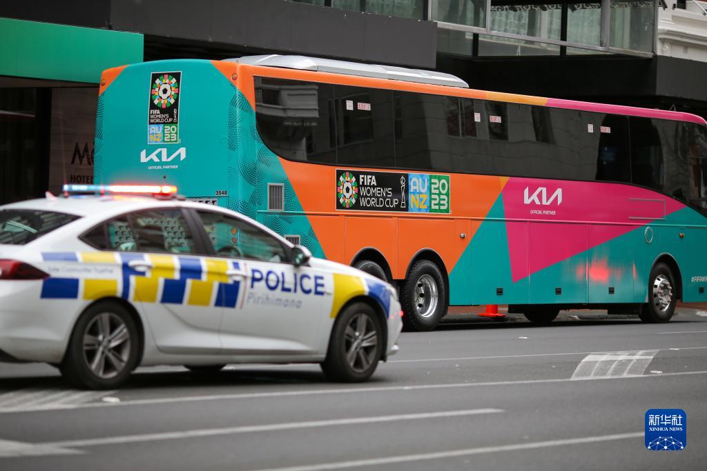 7月20日,在新西蘭奧克蘭,警車經過一輛女足世界盃專用巴士。