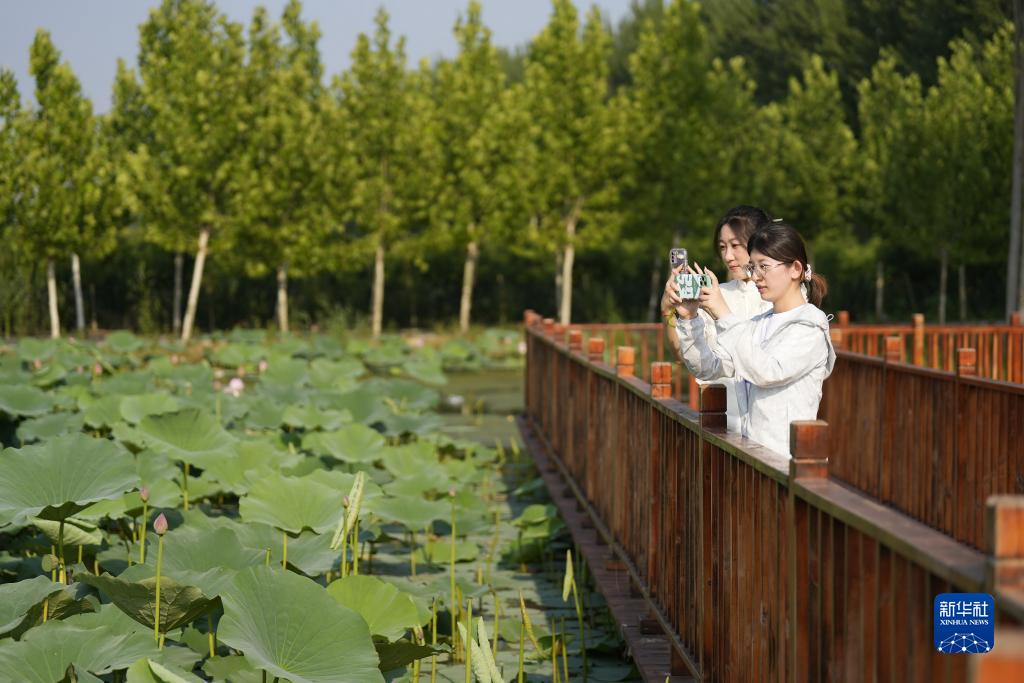 7月19日,游客在河北省唐山市豐南區北孫莊村一處水上游園內拍攝荷塘。