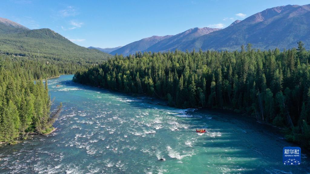 游客在新疆阿勒泰地區喀納斯景區體驗漂流項目(7月19日攝,無人機照片)。