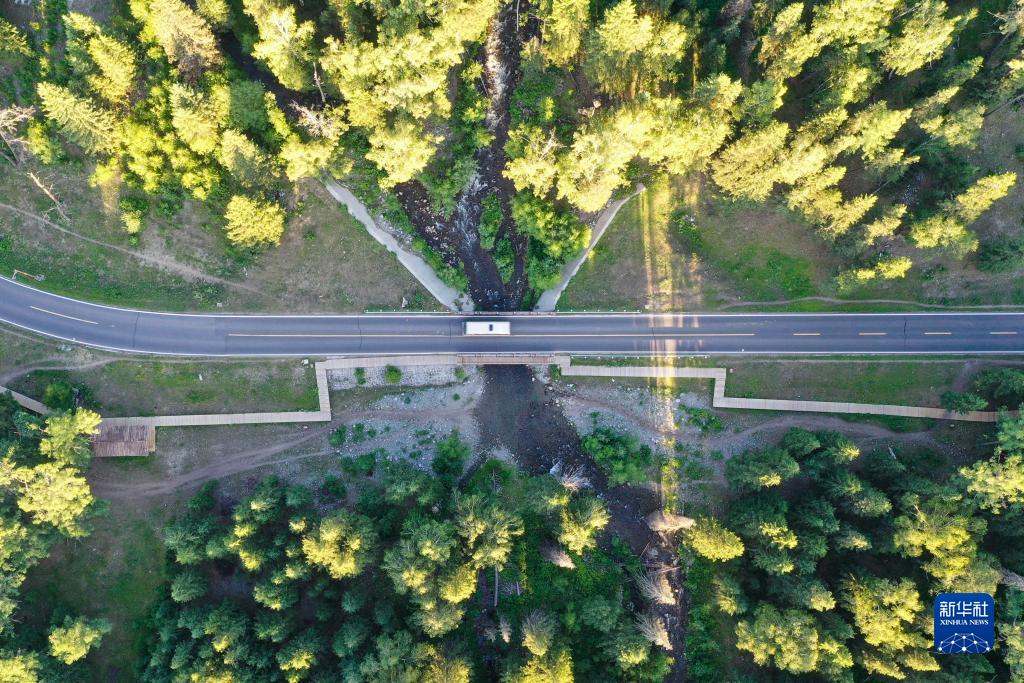 一輛旅游大巴車沿着盤山公路進入新疆阿勒泰地區喀納斯景區(7月19日攝,無人機照片)。