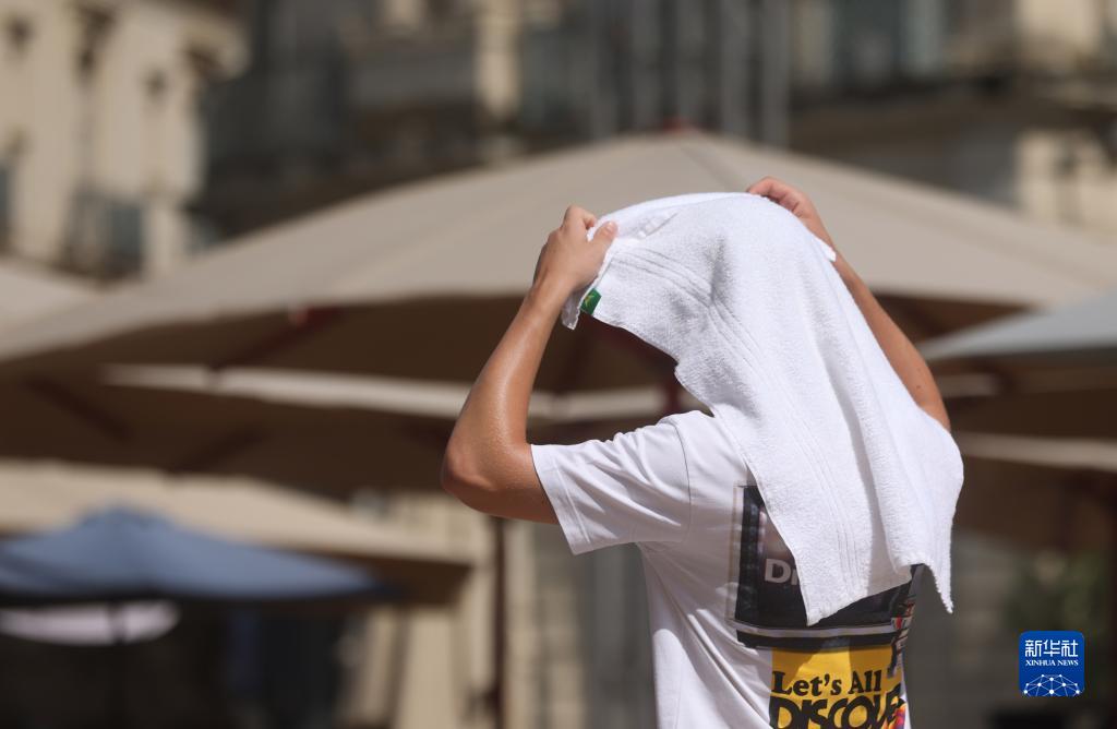 7月19日,在法國南部城市蒙彼利埃,一名男子用毛巾遮陽。