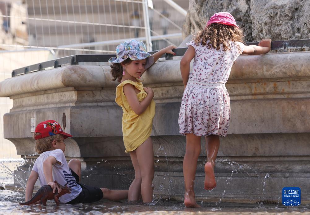 7月19日,在法國南部城市蒙彼利埃的喜劇廣場,孩子們在噴泉裏納涼。
