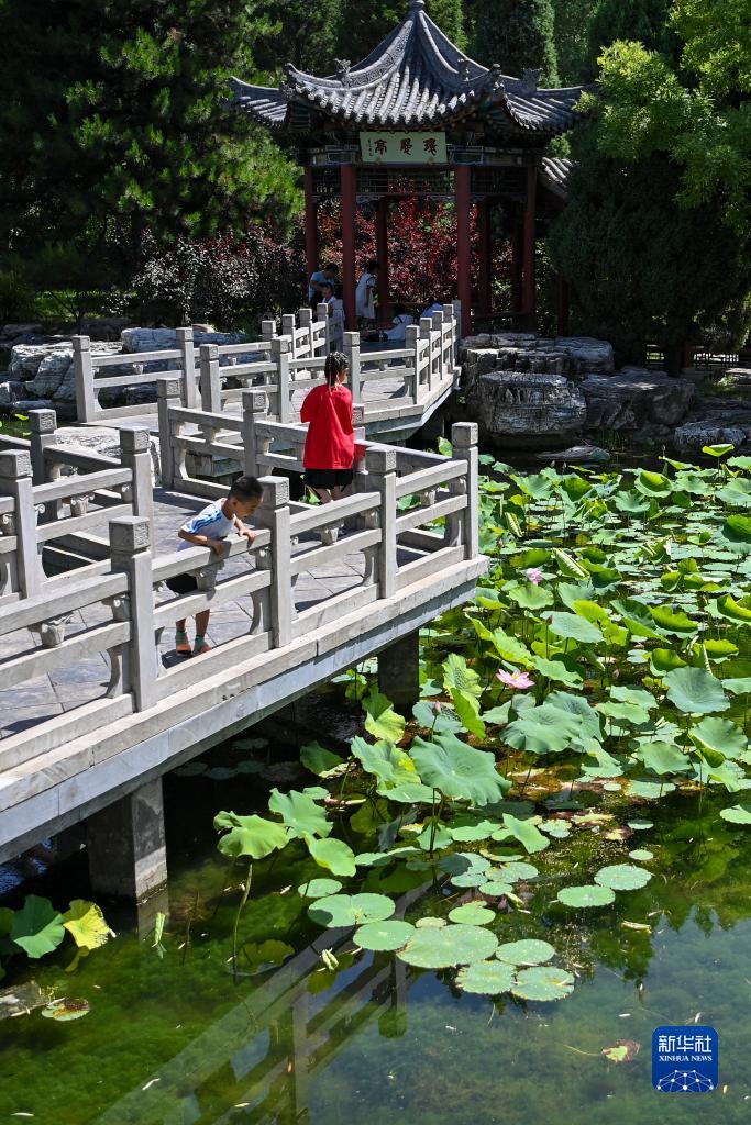 小朋友在晉祠中觀賞荷花(7月4日攝)。