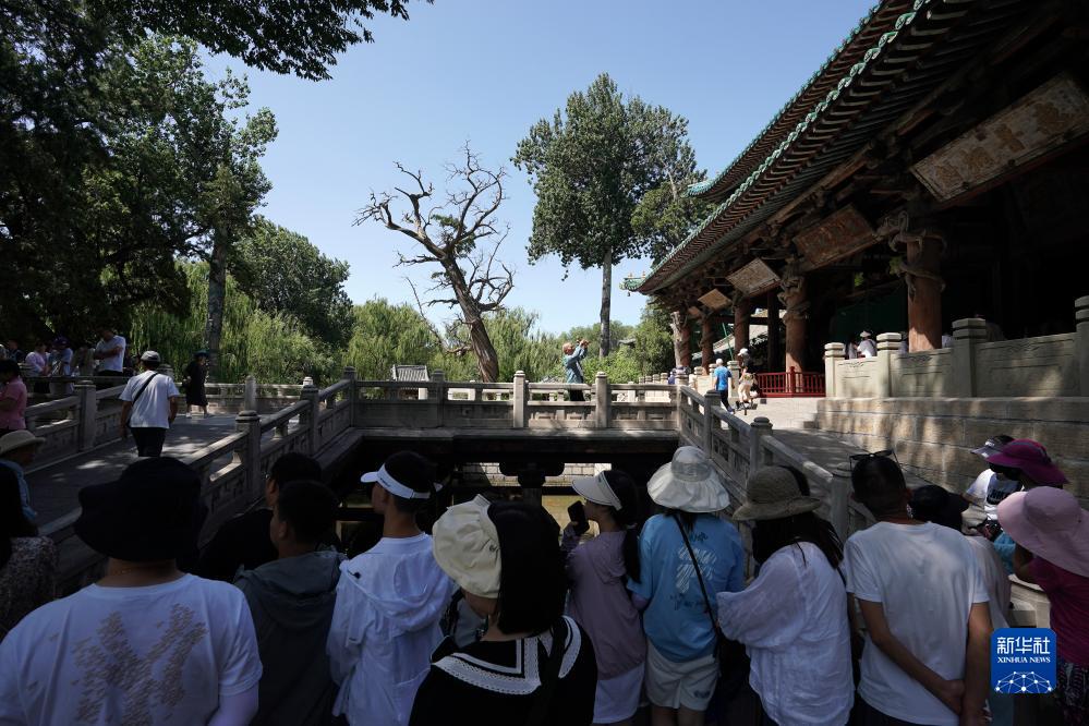 游客在晉祠聖母殿前觀看十字形古橋魚沼飛梁(7月4日攝)。
