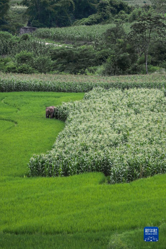 在雲南省普洱市江城縣,一頭亞洲象在稻田中覓食(7月19日攝)。