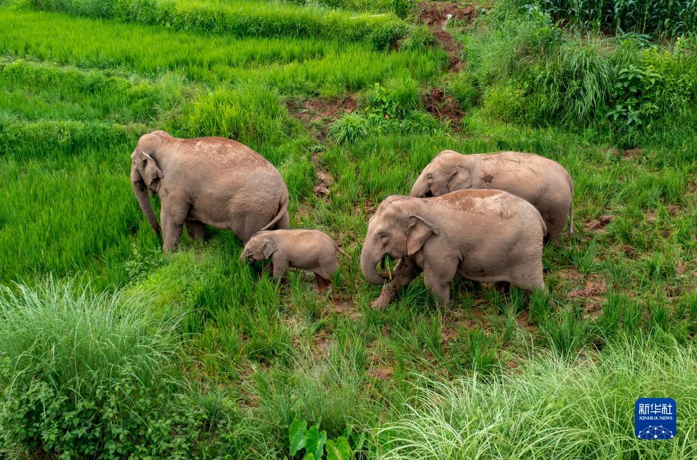 7月19日,四頭野生亞洲象在普洱市江城縣一處稻田裏覓食(無人機照片)。