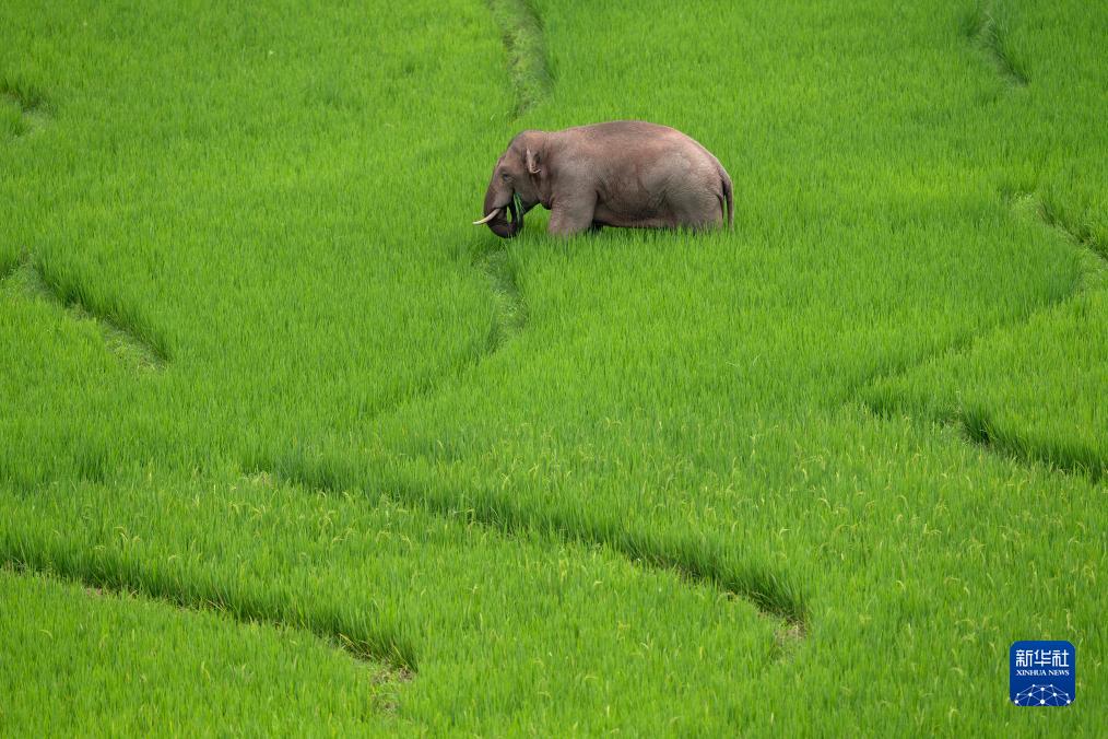 7月19日,一頭被叫做“大缺耳朵”的雄性亞洲象在稻田中“大快朵頤”。