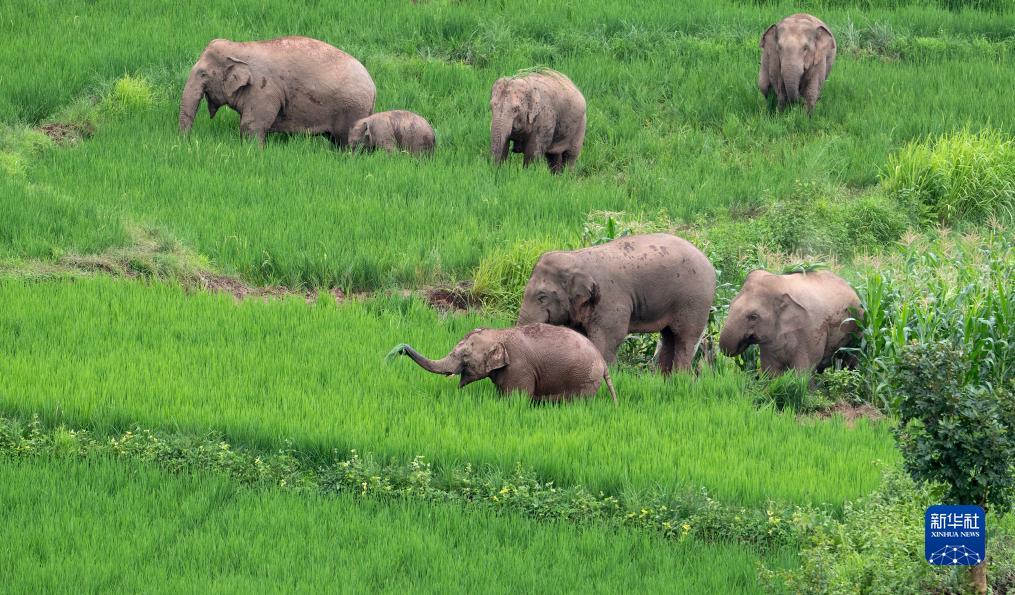 7月19日,一群亞洲象在稻田中“大快朵頤”。