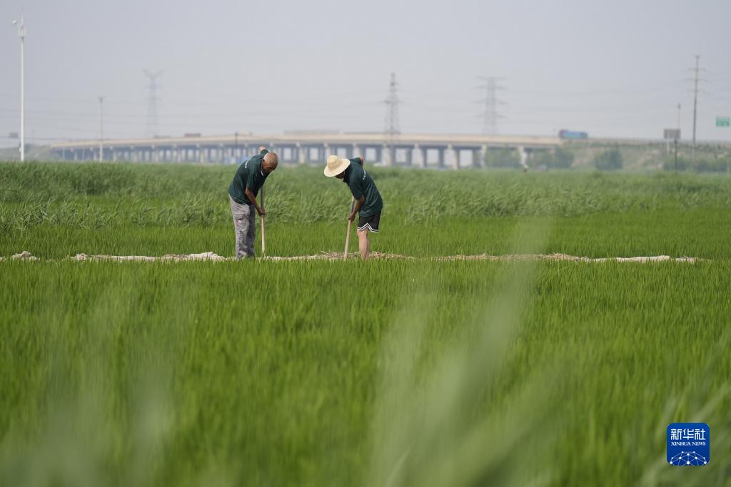 7月20日,河北省唐山市豐南區黑沿子鎮,工作人員在一處由鹽鹼地改良而成的稻漁綜合種養試點區內整理田埂。
