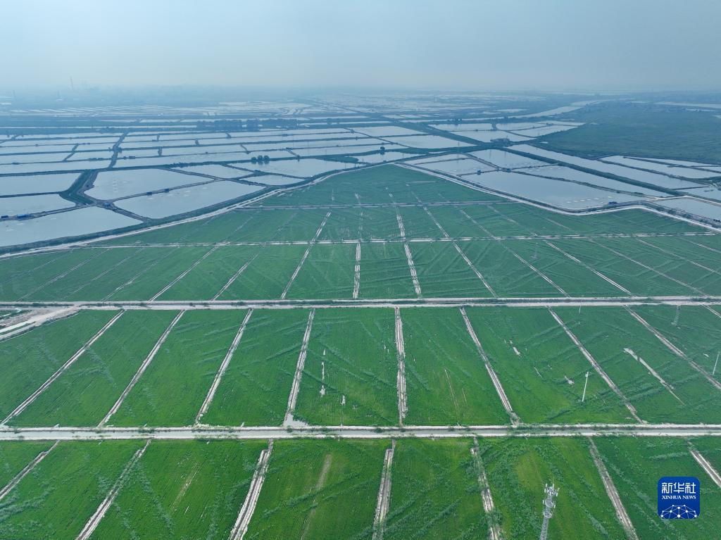 河北省唐山市豐南區黑沿子鎮由鹽鹼地改良而成的水稻田(7月20日攝,無人機照片)。