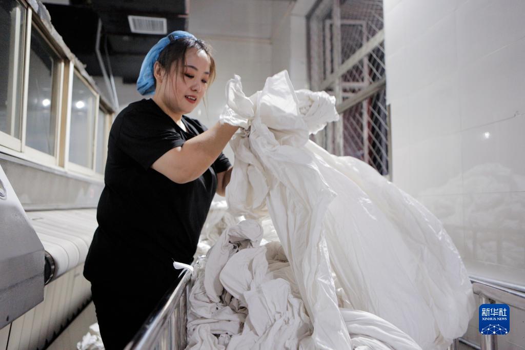 在牡丹江客運段牡(牡丹江)整備車間,洗滌二班班組長李濱整理清洗後的列車臥具備品(7月19日攝)。
