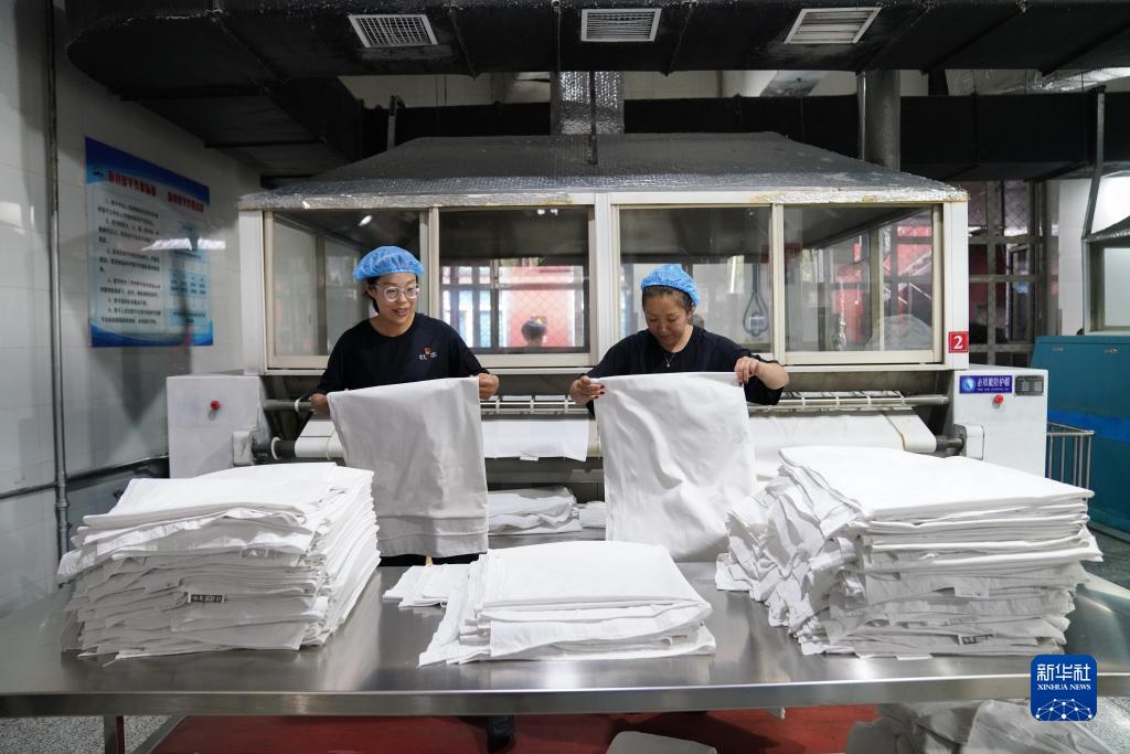在牡丹江客運段牡(牡丹江)整備車間,洗滌二班班組成員將烘乾後的列車臥具備品折疊(7月19日攝)。