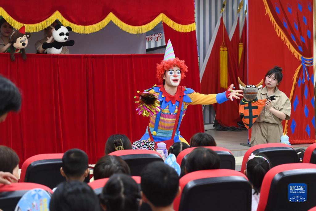 7月20日,在嘉興市秀洲區新塍鎮陡門村文化禮堂,秀湖音樂廳小橙堡兒童藝術劇團在演出兒童劇《紅鼻頭哥哥和小木偶們》。