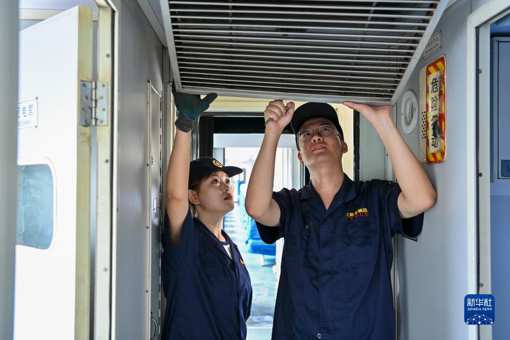 7月20日,劉萍格(左)和同事劉宸睿在一列客車上檢查空調回風濾網。