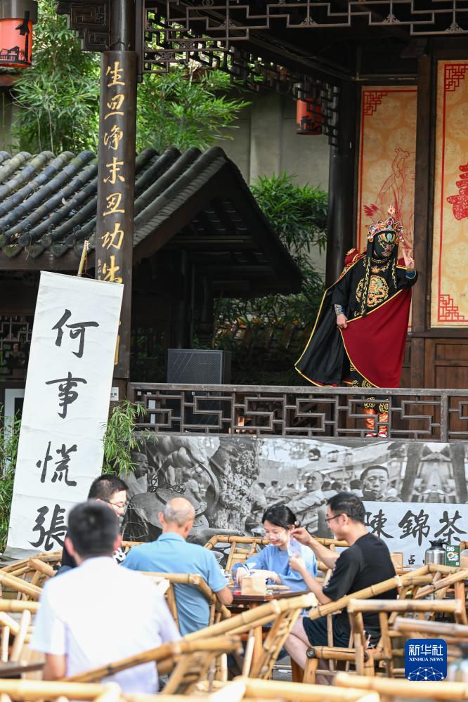 7月14日,游客在四川成都高新區的鐵像寺水街體驗蓋碗茶,戲&上一位川劇演員正在表演變臉。