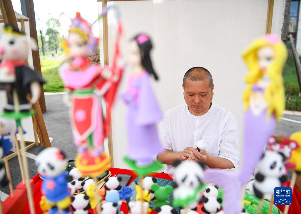 7月16日,在成都高新區桂溪生態公園,一位非遺傳承人在演示非物質文化遺産捏泥人。