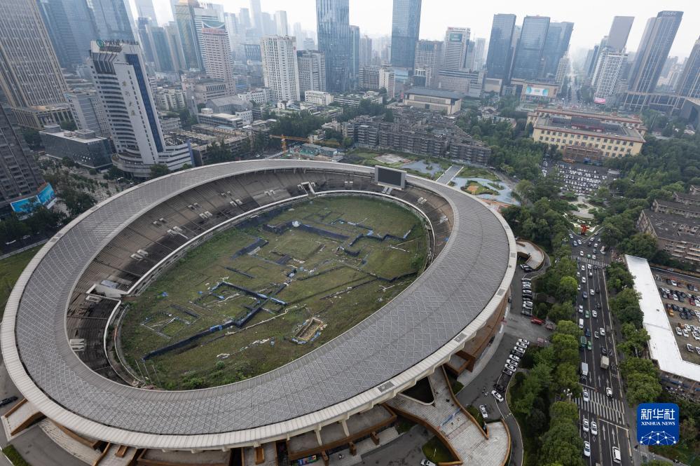 俯拍位於成都市中心的東華門遺址公園,成都體育中心立於遺址之上(7月19日攝),東華門遺址公園於7月20日對公眾開放。