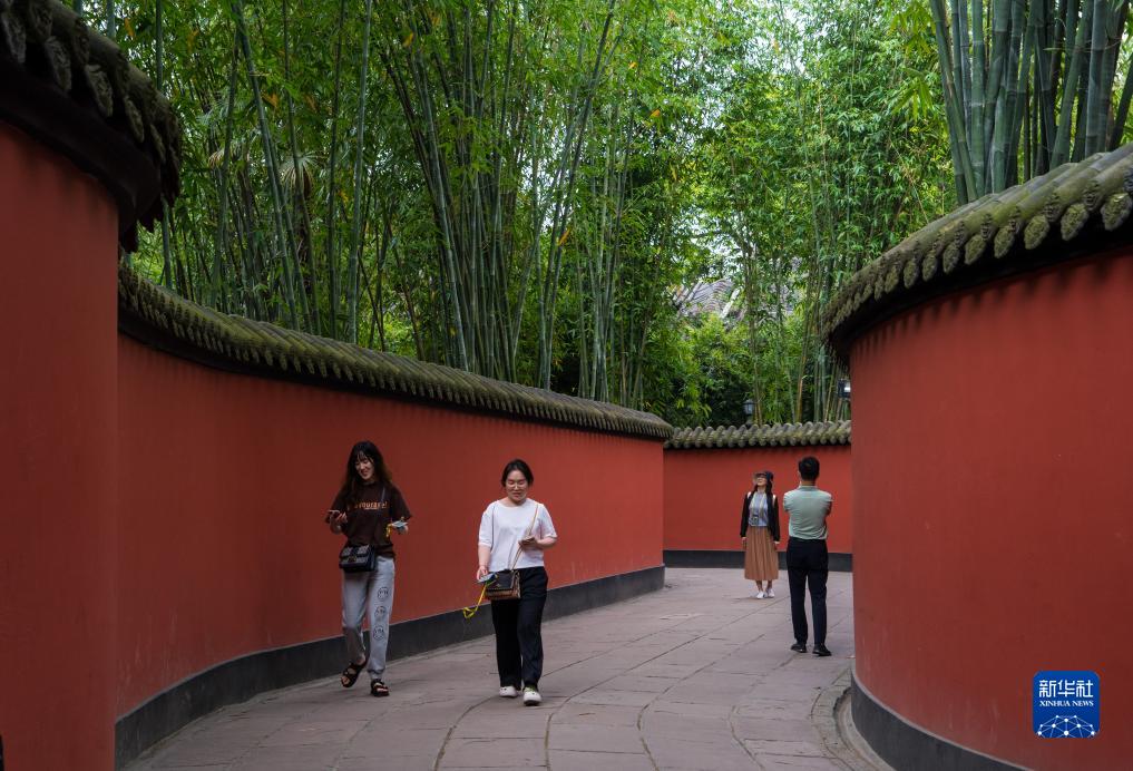 游客在成都武侯祠博物館的紅墻夾道中游覽、拍照(5月17日攝)。