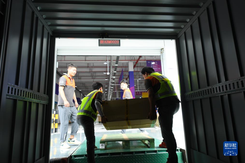 7月20日,圓通速遞工作人員在杭州亞運會物流中心卸下首批空運入境的亞運物資。