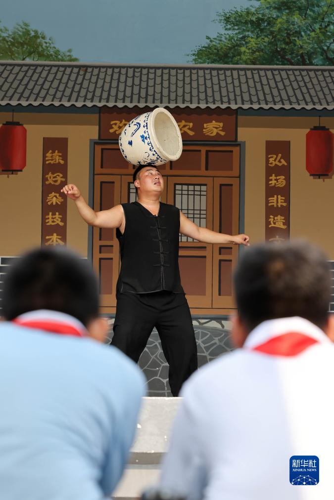 7月20日,在河北省滄州市吳橋縣吳橋雜技大世界景區,雜技演員為吳橋縣新興路小學學生展示傳統雜技項目。