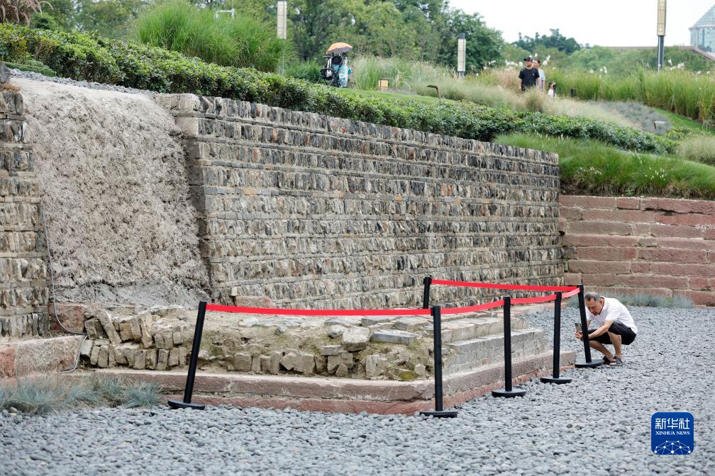 7月20日,在成都東華門遺址公園外場遺址區,參觀者拍攝原狀展示的明代蜀王府水道橋墩遺跡。
