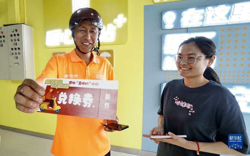 7月19日,在北京市大興區天宮院街道,一名超市配送員從工作人員處領取“小哥銀行”服務兌換券,可以兌換理髮、日用品、餐飲等服務。