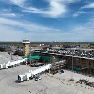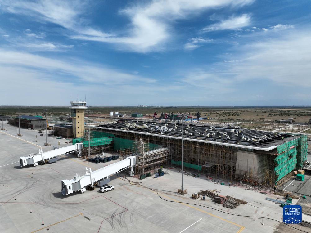 這是正在進行外立面裝飾施工的新疆奇&江布拉克機場航站樓(7月20日攝,無人機照片)。
