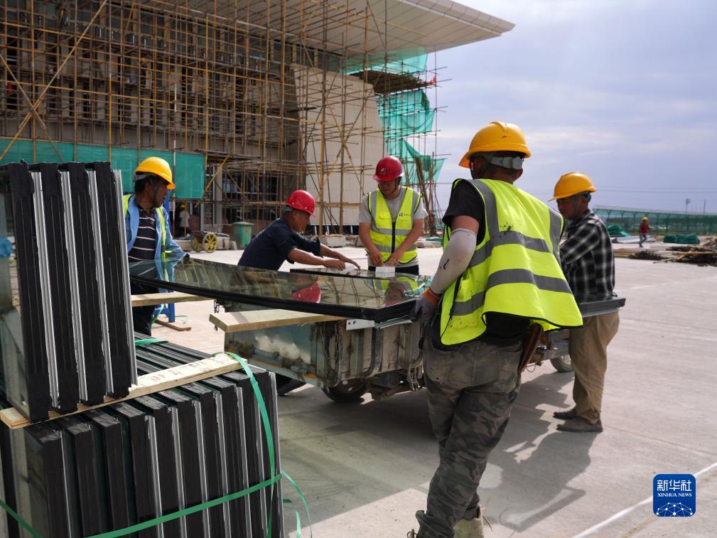 7月20日,在新疆奇&江布拉克機場,工人在搬運建築材料。
