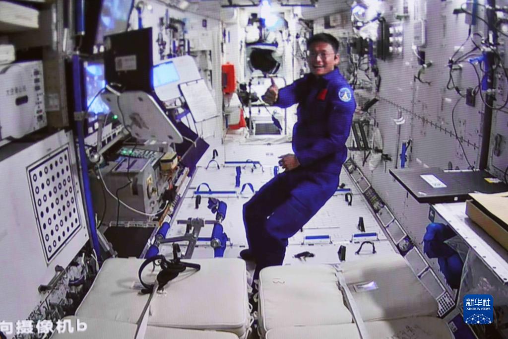 這是在北京航天飛行控制中心拍攝的神舟十六號航天員桂海潮為圓滿完成出艙任務的航天員景海鵬、朱楊柱點讚的畫面(7月20日攝)。