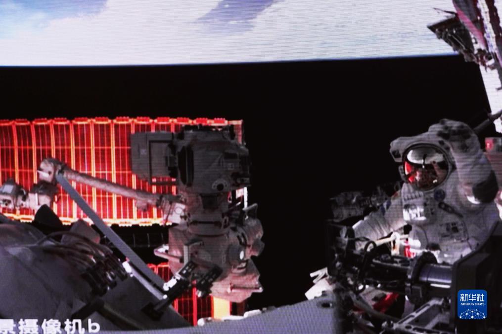 這是在北京航天飛行控制中心拍攝的神舟十六號航天員景海鵬成功出艙後揮手致意的畫面(7月20日攝)。