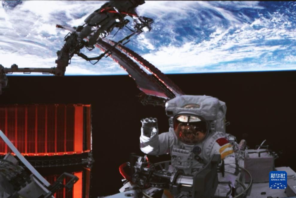 這是在北京航天飛行控制中心拍攝的神舟十六號航天員朱楊柱成功出艙後揮手致意的畫面(7月20日攝)。