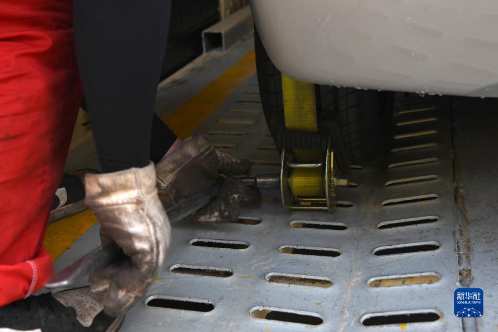 在廣西柳州雒容汽車物流基地,身着橘色制服的駕駛員嫻熟地駕駛着一輛輛小汽車在貨運列車車廂內行駛。到達指定位置停車後,駕駛員用緊固帶對車輪進行固定,完成裝載。