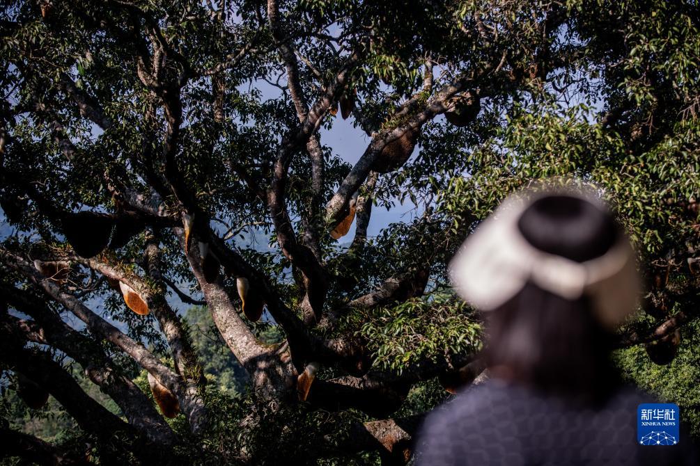游客在瀾滄縣景邁山參觀一棵枝幹上築有數十個蜂巢的榕樹,當地也稱此樹為“蜂王樹”(7月18日攝)。