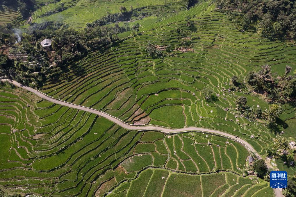 這是7月20日在印度尼西亞西爪哇省茂物地區的鄉間拍攝的稻田(無人機照片)。當前正值稻米收穫季。