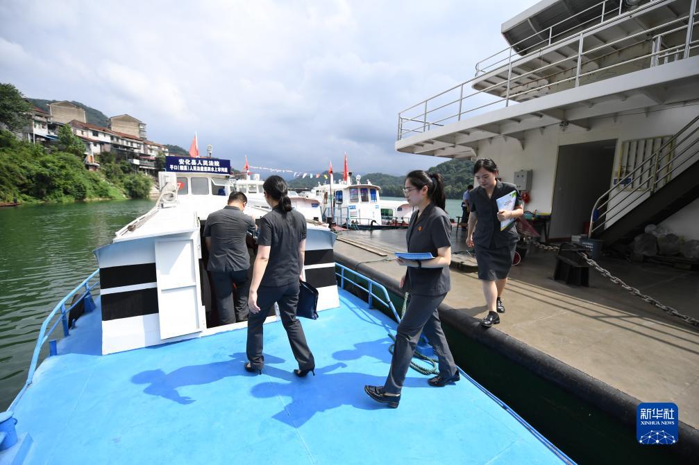 7月19日,安化縣人民法院幹警在柘溪客運碼頭登上“水上法庭”。