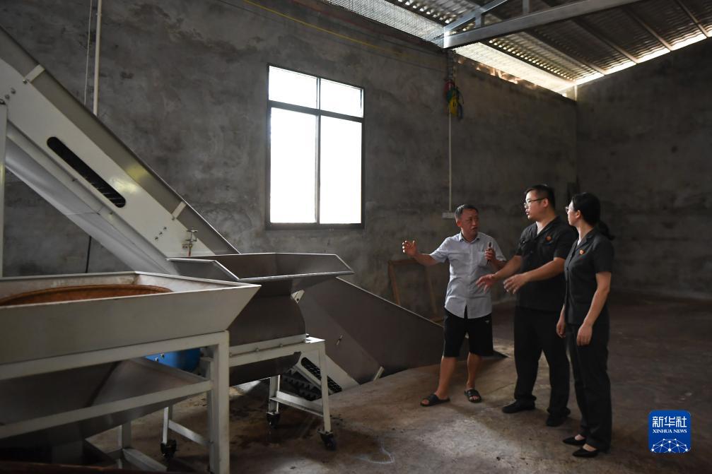 7月19日,安化縣人民法院幹警(右一、右二)在庫區沿岸的柘溪鎮唐溪茶場走訪,了解企業經營狀況。