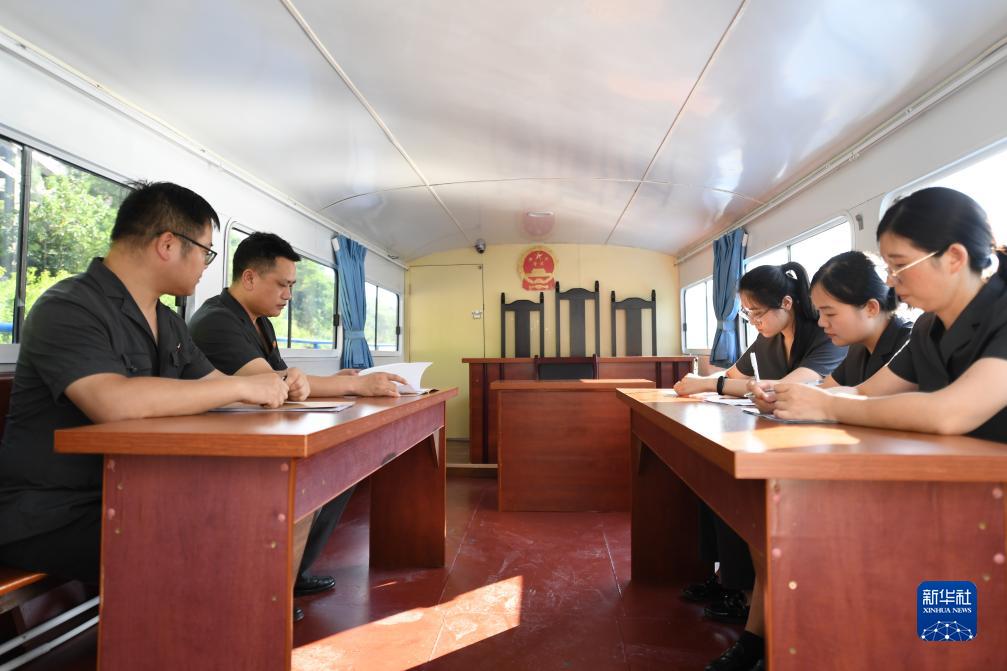 7月19日,安化縣人民法院幹警在“水上法庭”討論案情。