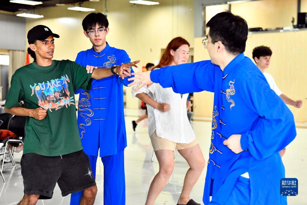 7月20日,在中國石油大學(華東)沉浸式中醫藥文化體驗中心,黃島區中醫醫院的醫護人員教留學生學習八段錦。