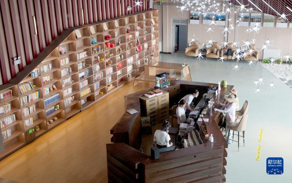 7月20日,工作人員在沙漠圖書館大廳給游客辦理借書。