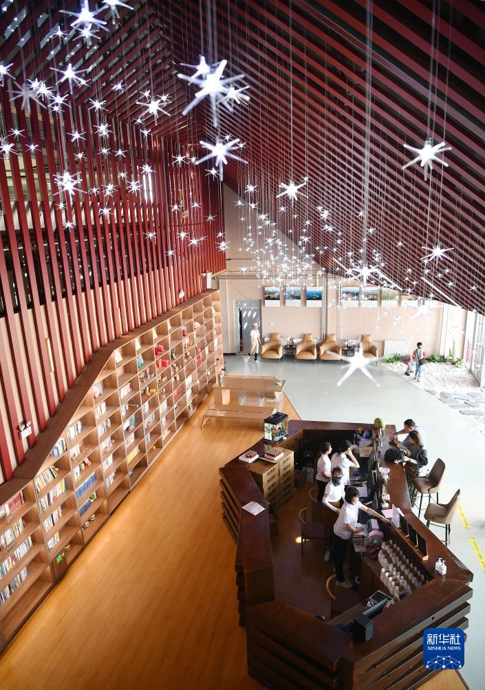 7月20日,工作人員在沙漠圖書館大廳給游客辦理借書。