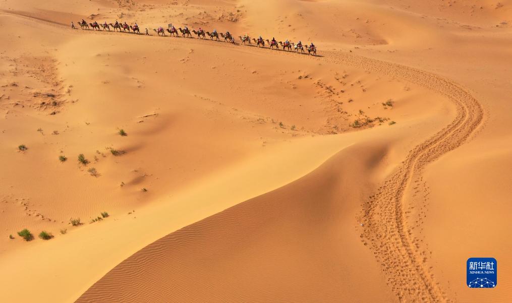 7月20日,游客在寧夏中衛市沙坡頭景區體驗沙漠騎駱駝(無人機照片)。