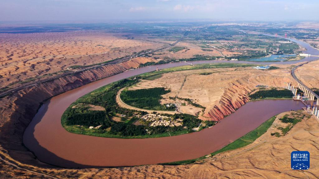 這是7月20日拍攝的位於黃河、沙漠交匯處的寧夏中衛市沙坡頭景區(無人機照片)。