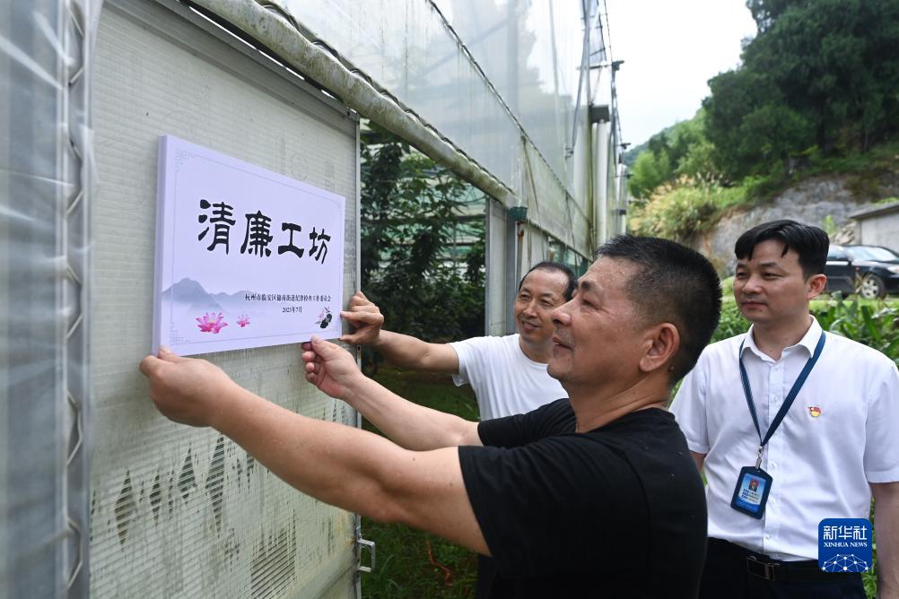 7月21日,在杭州市臨安區錦南街道上甘村綠明農業種植基地內,負責人將街道授予的“清廉工坊”牌子挂在大棚門口。錦南街道街道紀工委聯合街道區域發展辦,組建“共富工坊”專項監管小組,對各個共富工坊的日常運行、資金流動、工資支付等方面採取不定期實地查驗,及時掌握“共富工坊”的運行動態,並為運行透明有效的工坊授予“清廉工坊”榮譽稱號。